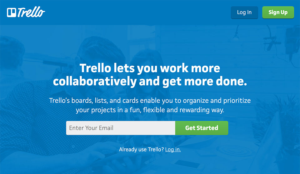 例如办公协作应用Trelllo的官网顶部没有导航,只保留了登陆和注册入口。页面的信息组织