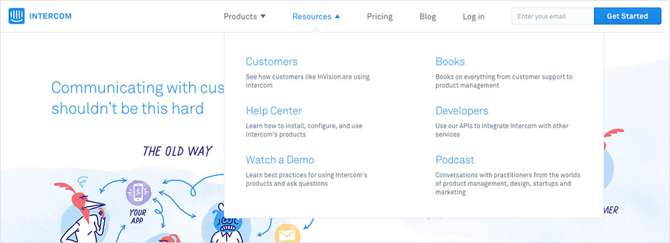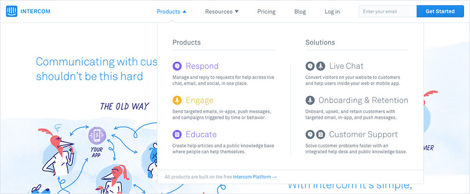 以Intercom为例,它是一款大型CRM应用,公司旗下有三大子产品。官网首页设置了 5 个一级导航,其中前两个是折叠导航。最重要的Products导航的下拉菜单中按照产品和解决方案两个维度展示了对应的信息。配合icon和简介,有序又直观: