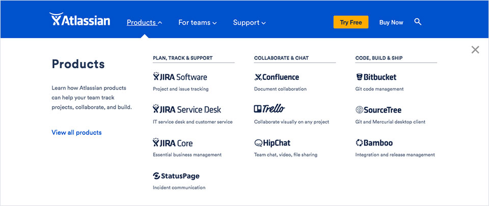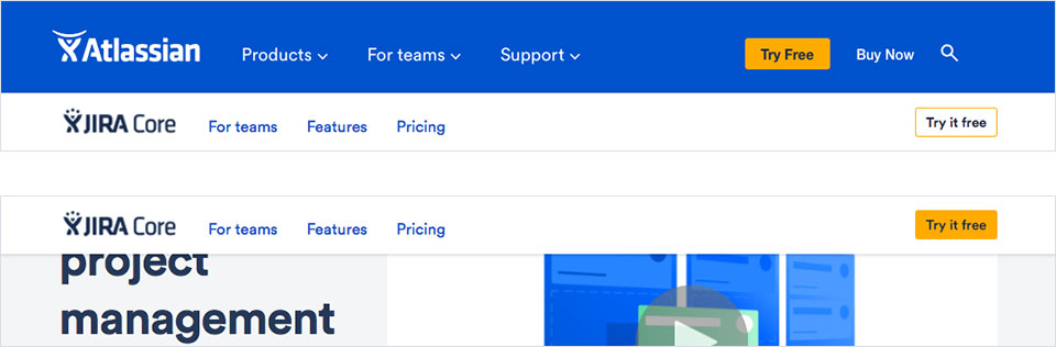 再看看Atlassian的设计。到达子产品页后会保留主导航,随着页面滚动,子产品导航会把主导航推出,继而代替主导航的位置: