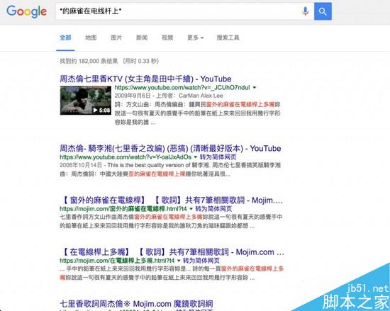 如果你想搜索的内容中,有一些部分你不能完全确定,比如最常见的情况,在路边听到的某首歌,只记住了零星的歌词,或者是听别人口头跟你说的东西,但是东北腔、福建腔太重时,你可能没听懂一些关键词,这时候星号就派上用场了。