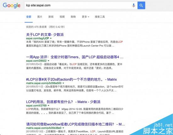 比如经常会有作者把 Launch Center Pro 简写成 LCP,在查找 LCP 的小技巧时,想看看有多少文章提到过?不妨试试用 Google 搜索「lcp site:sspai.com」。