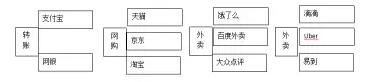 举几个实际的例子,我们平时网上转账会想到支付宝或网银;网上购物会想到淘宝、天猫、京东;上班吃外卖会想到饿了么、百度外卖、大众点评等一些APP产品;打车会滴滴、UBER、易到等打车软件。