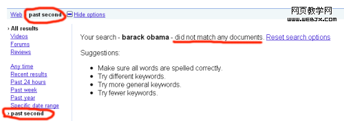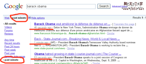 在谷歌于5月份推出的“搜索选项”中,有一个根据时间来限制搜索结果的功能,用户可以根据默认的“任何时间”、“去年”、“上周”、“最近”或者“过去24小时”进行搜索,但是,这仍与“实时”存在相当大的差距。谷歌没法提供过去1分钟甚至1秒钟内的搜索。但有一个小窍门,可以通过在搜索URL中加入参数,缩短该时间值。