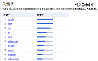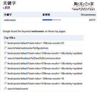 可能有细心的站长已经注意到了,谷歌网站站长工具(又名谷歌网站管理员工具)在11月中旬对“关键字”分析部分界面做了新的调整。调整之后,我们会每天更新关键字分析数据,向站长提供网站收录过程中关键字出现频率的信息,并展示一系列包含该关键字的URL。我们将某关键字在网页上的出现频率与全站内出现最频繁的关键字进行对比,从而绘出关键字的“重要性”条形图(参考下图)。点击某个关键字你将看到10个包含该关键字的站内URL。
