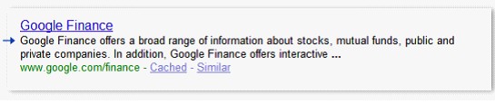 优秀的描述元标签应被用于网页摘要;使用Google.com 搜索[google finance]的结果,2009年9月。