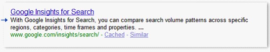 网页摘要来自于页面中的文本,但却不具备描述元标签(description meta tag):通过 Google.com 搜索[ google insights ]的结果,2009年9月。