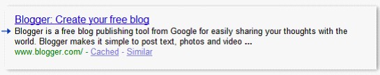 内容饱满的描述元标签被用于网页摘要;使用Google.com搜索[ google blogger ]的结果,2009年9月。