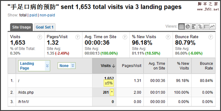 这是一个有些“极端的”例子,不过却能说明问题。例如,如果我们发现某个关键词的bounce rate非常高,我们应该采取什么样的方法进行网站优化/SEO优化?一个常用的思路,哪里不好,就细分哪里!我肯定会毫不犹豫的按照landing page来细分某个“糟糕”关键词的表现,例如“手足口病的预防”这个关键词。在Google Analytics中,我们得到如下的数据。