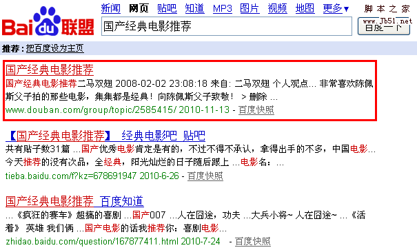 这是豆瓣上的另一个群组在百度上的排名,“国产经典电影推荐”这个词每天的搜索量大概在300左右,但是如果你用自己的网站的二级栏目去做,不一定能做上去,而如果用一个新的域名或二级域名又显得有点浪费资源。用豆瓣的群组只要稍作引导,就可以轻易的将排名做上去,然后将流量导入到自己的网站上。