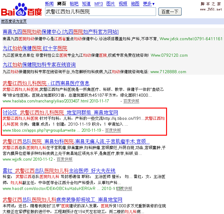 这是南昌本地的一个医院在地宝网兴趣小组创建的小组,当天创建就收录,排名比他自己的官方网站还高。