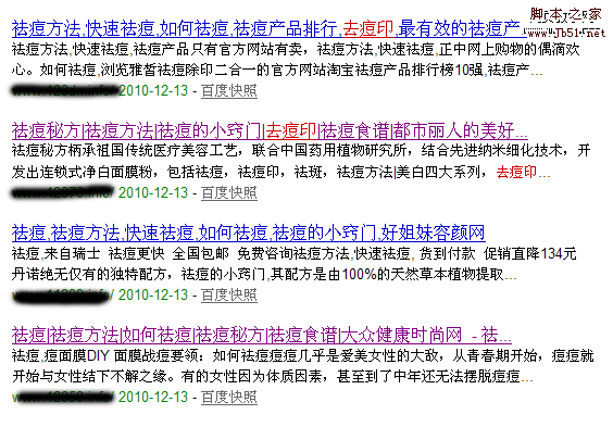说到外联优化,或许有些新手站长只听说过关键字优化,至于外联优化可能还是第一次接触,其实在我们做的一些外联中,如果我们对自己网站外联做一些优化的话,会对自己网站关键字排名很有帮助。闲话不多说,一事例来说明问题,大家搜索去痘印,看到的结果是什么?是不是下面个位置都是由一批站群网站占据的呢?我做了个截图