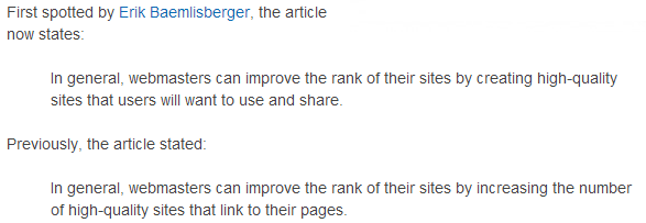 Google排名的新思想似乎某种程度上“鼓励”了这种做法。在过去,Google的排名算法思想中很明确地提到了要注意“links”,而现在“links”似乎不再那么直白的被提及。Erik Baemlisberger,SEO界的知名专家,最先注意到Google的这种改变,在Google的Ranking Help文章中,有这样的表述:“In general, webmasters can improve the rank of their sites by creating high-quality sites that users will want to use and share. (总体上,用户喜闻乐见和乐于分享的高质量网站能够在排名上有更好表现)”。而过去,同样的这个文章的表述是:“In general, webmasters can improve the rank of their sites by increasing the number of high-quality sites that link to their pages. (总体上,为自己的网站带来更多高质量网站的链接,能够增进排名)”。二者的变化显而易见,如下图所示: