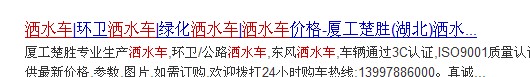 这个网站标题就写的太长,后面就跟本不知道写的是什么内容,其实这个标题完全不用出现那么多次“洒水车”,要是合理排序的话,根本用不了这么多字,可以直接写成“环卫绿化洒水车价格-厦工楚胜(因为后面的我也没看,所以就没写,应该是公司的名称)”,这样的话搜索“洒水车”、“环卫洒水车”、“绿化洒水车”、“洒水车价格”你的网站名称都是符合要求的,这样用户看起来也舒服。