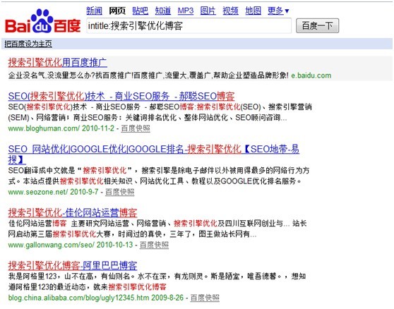 上图为未增加intitle指令的搜索引擎结果,大家很容易发现只要在description或keyword或者正文有此关键词都有可能被返回搜索结果,而运用了intitle之后如下图,很容易看到搜索结果必须是在网站的title中包含关键词才被返回。这条命令的最大价值在于对某个关键词更加深入的了解竞争对手(大家都说title很重要嘛)。