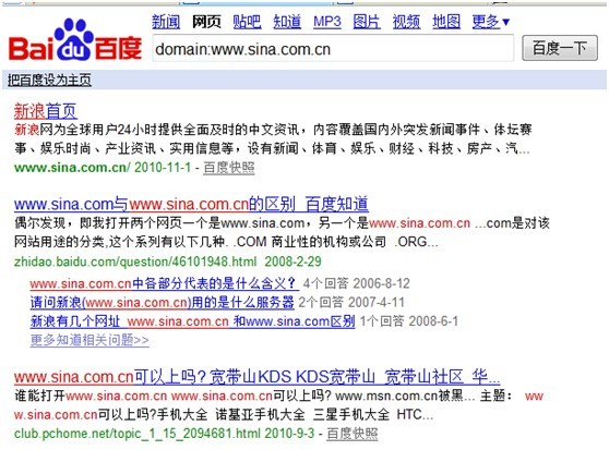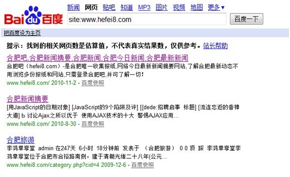 site指令很容易理解,是检查网站被搜索友情抓取的页面,很多做优化的人非常重视这个site结果,在前段时间百度公布的搜索引擎优化指南中说到baidu中的site结果仅供参考,非准确的结果。经常用site的人也会发现,你往收录也的后面点击的时候,会发现收录总数在不断增加会减少。所以此条指令虽然常用,但是不能作为唯一标准。