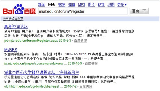 此条指令可能很多人不明白是什么意思,“inurl”——网址中包含edu.cn的网站同时含有forunm和register这2个单词,*为通用符。因为大家常用forunm和register表示注册页面。最终表达的意思所有教育类网站的注册页面,这样很容易找到高价值的论坛来供大家发布外部链接