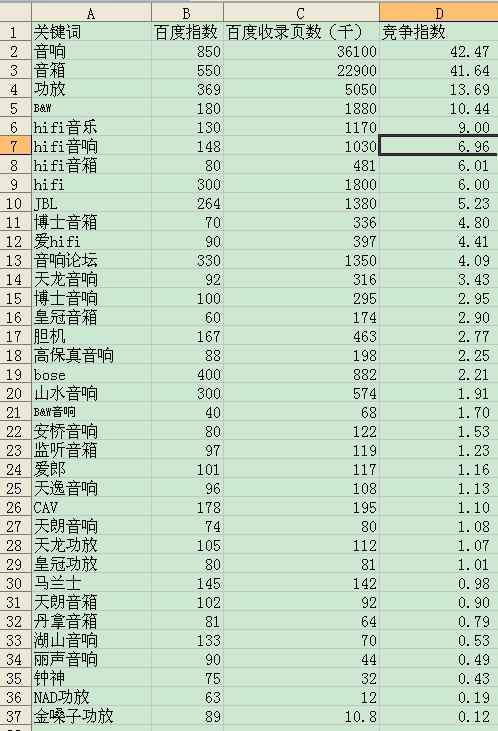 5、从这张表格可以看到,“音响”和“音箱”这2关键词高高居上,就像北京奥运会的中美两国一样形成第一梯队。去百度搜下,这两关键词前几页都是各大网站首页,其中不乏些门户网站,比较难做。