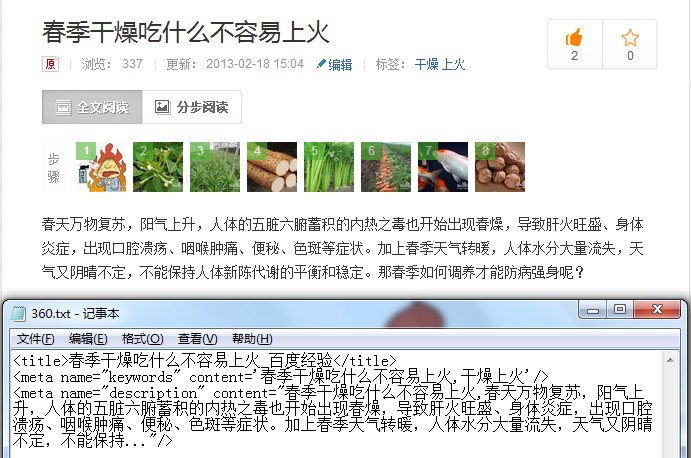 显然,从上面的代码中,我们看到百度经验的头文件可以说title目录明确,keywords部分控制在两个词,内容上则选取了一个是标题文章,一个是长尾关键字。通过查看其它经验,也是同样的情况。即标题+标题核心关键长尾词。description部分则选取的是这篇经验的导读内容,字数控制在 110内。