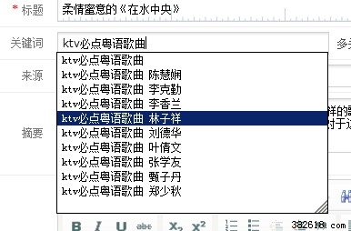 只要我们用好这个Tags标签的话,就可以源源不断地为我们创造页面内容。譬如说,笔者想在自己的网站内更新一篇介绍“在水中央”这首歌的文章,那么当笔者撰写完毕后,只要在输入Tags的关键词栏目里添加“ktv必点粤语歌曲”和“林子祥”两个关键字后,那么其实就会同步更新三个页面,分别是“在水中央”的文章页、“ktv必点粤语歌曲”以及“林子祥”这两个关键字的标签页,如图4。