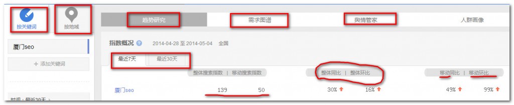 根据以上图片可知,百度指数中可以搜索到关于该词的搜索量,行业的搜索量等,同时可以按照关键词也可以按照地域进行搜索,并且可以在添加关键词中添加关键词进行多个关键词的搜索。同时百度指数还可以进行一个趋势的研究,需求图谱的分析以及需求人群分析,并且提供了舆情管家。在热点趋势部分,还可以研究近期以及比较长的时间的趋势的指数状态。从而可以得知该关键词搜索量的热门期和冷门期,从而相对的可以得知相应产品的需求或者用户关注的一个时间段,从而可以更好的进行网站内容的设计。当然,百度指数还有其他功能,在此就不进行详细介绍。