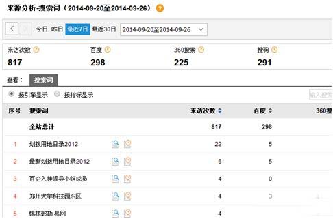 我们经过千辛万苦做的关键词有没有效果呢,有没有带来流量呢,可以通过搜索词来查看。一般新做的关键词1-2周后就可以看到效果了,你只要看一下这两周的搜索词有没有出现你做的那些关键词,有的话就是有效果了。没有的话就要好好分析原因,是不是排名没上来,或者是无效关键词,排名上去了没流量。另外,还可以看一下流量主要是来自哪个搜索引擎的,是否跟你预期的一样。