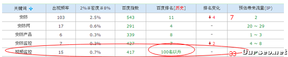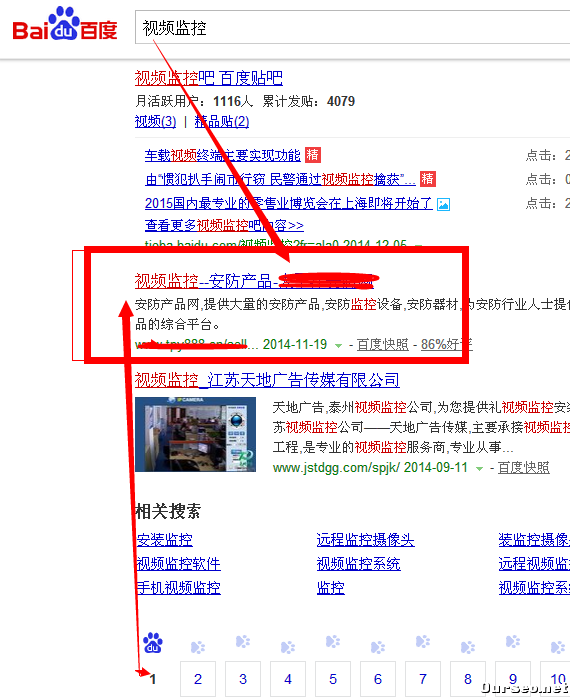 当时就针对这个关键字所对应的URL做了几个同行友情链接,锚文字就以“视频监控”为关键字而链接就以该关键字所对应的URL,又选择了几个权重比较好的博客并且这几个博客也没有添加rel=“nofollow”标签。撰写了几篇与关键字“视频监控”相关的文章发布到博客中,在文章中选择一个“视频监控”关键字做上锚文字指向该关键字所对应的页面。坚持每天所更新的博客中只要出现“视频监控”这个关键字就做上锚文字或直接留下对应页面的URL,这样持续做了两周“视频监控”关键字就从100名以外跳跃到了百度搜索首页如下图所示: