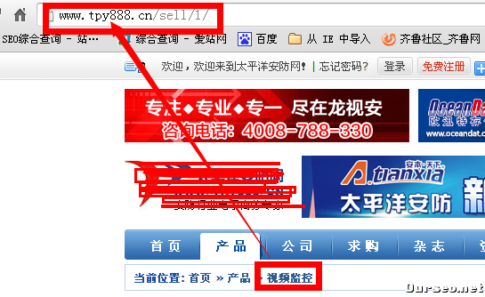 从图中可见“视频监控”这个关键字的指数在417其在行业中的竞争度也算高的了,当时采用工具查询时看见该关键词排名在100名以外,我就针对该关键词做了一些优化,其优化的手法也非常简单就是采用外链和锚链接来做的。而使用的URL就是网站的一个视频监控产品分类类目如下图所示:
