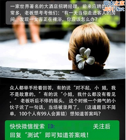 这种方法其实常见的就是去网上收集一些比较有趣味的问答等,在收集题材的时候一定要准备好留下最重要的答案或分析,要让人有一种强烈想知道答案的欲望,这样就可以引导潜在粉丝去关注我们的公众微信。比如: