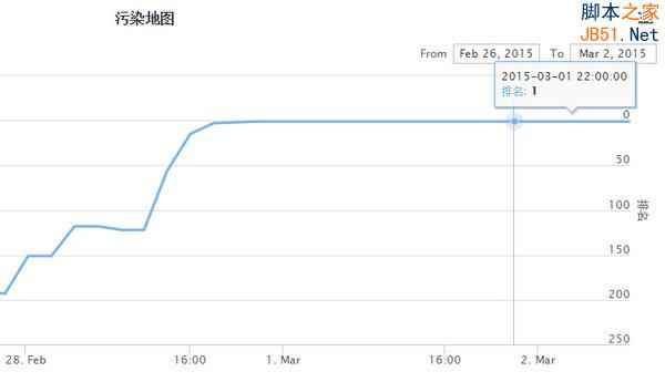 其次,接着再看下app annie的搜索指数,app annie是一款app stroe应用排名监控系统,通过app annie发现,污染地图的app stroe的排行位置,也从总榜的253名,窜到了总榜的第一名,之前的分类榜单第一名是墨迹天气,现在墨迹天气是第二,污染地图是第一。据悉,app stroe中国分类总榜每天的下载量是20万,这个数据是我这几年前听到的,目前可能会更大,可能40万,因为几年间苹果的用户已经翻倍了。如果说,一个高质量的app要想冲到app stroe的排行榜第一的话,一天至少需要20万以上的量才能达到总榜第一,如果按照一个cpa5元来算,一天的花费至少需要100万元。