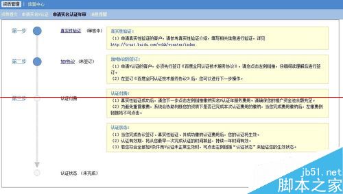 3、进入 资质管理 页面点击第一步: 真实性验证