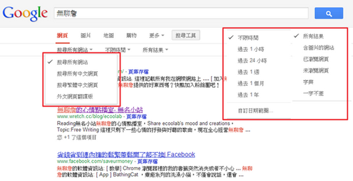 我们先来复习一下以往我们最常使用的搜寻方式,直接输入搜寻的关键字,顶多选择搜寻所有网站还是繁体中文、时间点、再来就是以简单的空白键区隔不同关键字,但仍然很难在搜寻结果中迅速锁定目标。