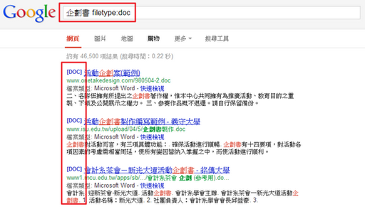 当学生需要做报告、上班族需要查找资料的时候,我们常常需要找的是Word文件或者是PPT简报,该怎么搜寻特定副档名?这时候可以直接在Google搜寻框内输入filetype:doc,搜寻出来的结果就会全部都是Word的文件档啰!使用者可以依照需要自己输入要搜寻的副档名。