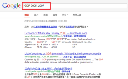 这通常会用在查找新闻或某一段区间的数据时,比方我想搜寻2005年到2007年的GDP数据,如果打GDP可能要从许多资料中去捞出我想要的结果,但如果输入的是GDP 2005..2007,那就可以搜寻某个期间内的资料。