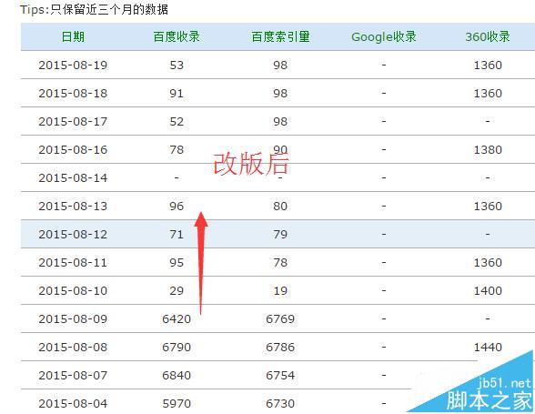 改版后的站点,跟新建站点不一样,所以录入速度会很快的,新站点需求去吸引蜘蛛,可是改版,原本站点天天蜘蛛的抓取压力仍是挺多的,改版后仍是会持续抓取的,比方我的站点,也是刚 改版,新站录入也立刻上来了,首页也并没有被k,