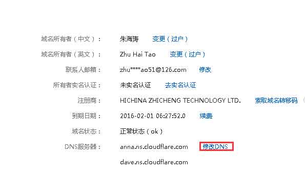 如我现在使用的是万网域名,我的域名解析服务器是"dns9.hichina.com",现在需要将服务器修改为cloudflare服务器。