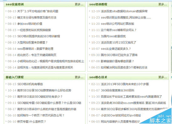 由此看来,大部分网站都有一个不好地方在于主要区块的链接是按时间生成的(当然新闻类的按时间应该给予最高权重),就拿我的网站来说,下面6个主要区块都 是按照时间排序的,效果可能打折扣,所以我准备去掉文章前面的时间,另外采用权重调用方式避免文章顺序经常变动,在上述操作过程中无疑增加了页面的制作成 本(我需要精心挑选出一些好点的文章放在首页),期待我的小心求证吧!