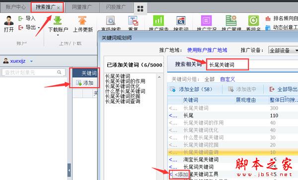百度推广客户端关键词挖掘工具步骤:下载并登陆,点击【搜索推广】、【关键词】、【添加】、搜索框中输入需要挖掘的长尾关键词,找出有价值、相关的长尾关键词添加即可。