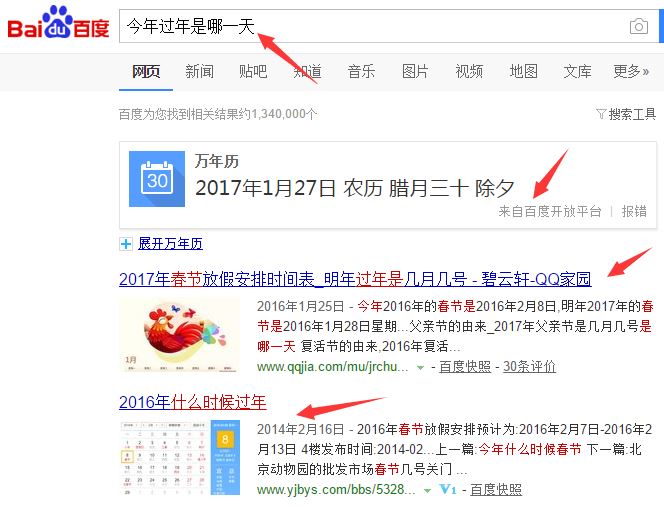 首先需要了解什么是SEO,为什么要用SEO?网民上网都会使用百度、谷歌等搜索引擎来搜索信息,例如,用百度搜索“今年过年是哪一天”,如图所示,结果列表中的第一条信息来自“万年历”(这个是百度阿拉丁通道),第二条信息来自“qq家园”,等等。从中可以很快找到需要的信息。