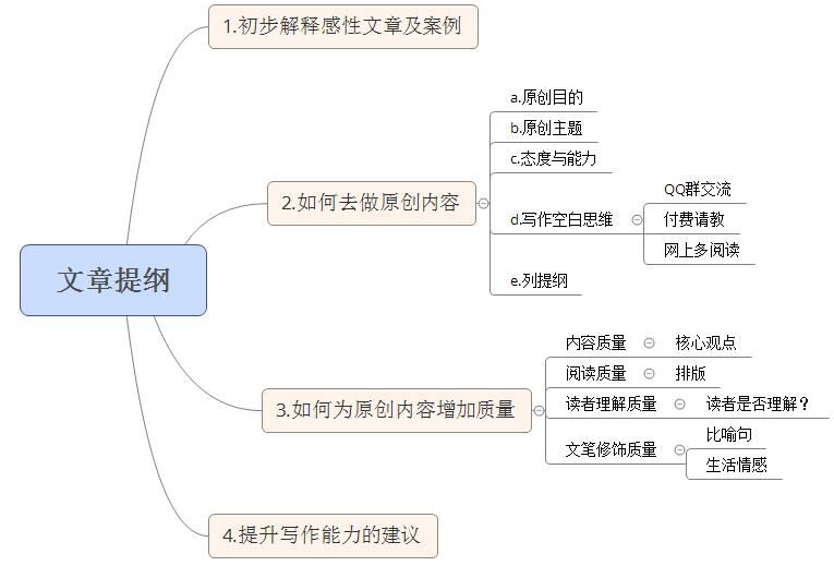 5.列提纲:写作之前列一个提纲也是非常不错的选择,列提纲的好处非常多,一来是给了写作的清晰思路,二来是防止写作内容脱离主题,大家可以在尝试写一篇文章之前列一个文章提纲,相信文章质量会得到很大的提升,下图是笔者针对本文列的一个大致提纲: