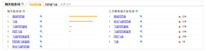 什么是长尾关键词?即,用户经常会用哪些关键词查找你的产品,从百度指数来看,“网页飞信”“飞信网页版登录”“网页版飞信登陆”等都是长尾关键词,特别记得把常用的错别字也算上(例如,专业人士一般用“登录”,而不是“登陆”,所以记得保留“登陆”这种关键词搜索场景)