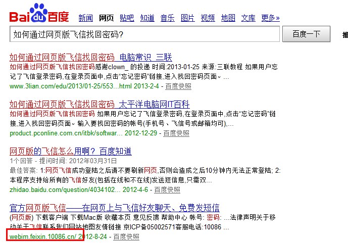 不过,“网页版飞信”“飞信网页版”都已经排在百度搜索结果的第一位,即使不改名也无大碍,百度视二者是一个东西了。