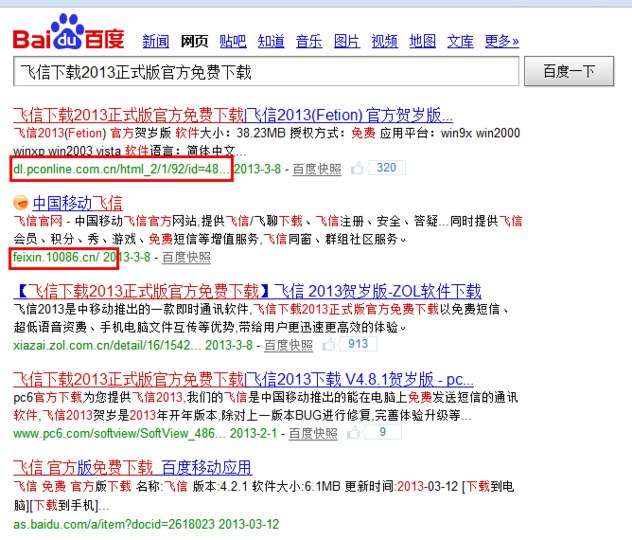 值得一提的是,有很多下载站通过这种手段在蹭流量。看看这个词“飞信下载2013官方免费下载”,我相信用户是不会主动输入这么长的关键词。到百度一查,真相出来了:第一位是太平洋电脑网的页面,哈哈,你懂的。