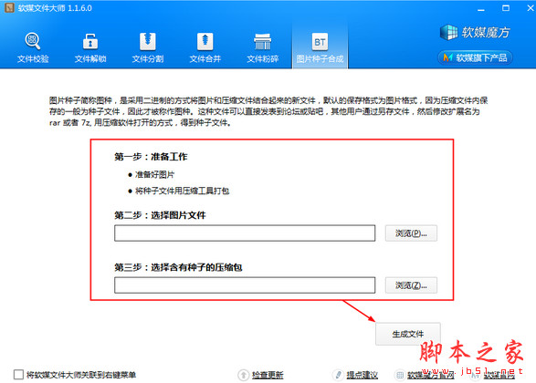 软媒文件大师是一款拥有文件合并、文件校验、文件分割、文件解锁、文件粉碎及图片种子合并。其中图片种子合并能够降低图片储存空间,适合发到论坛帖子,合成只需三步。