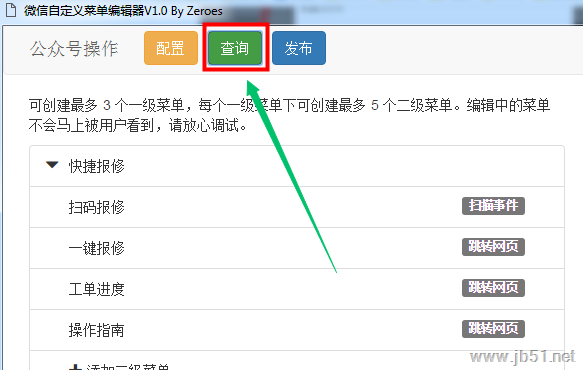 2、点击查询可以调用微信公众号的查询菜单