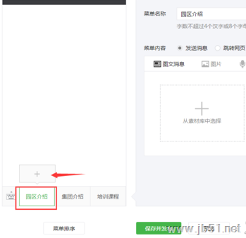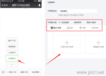 6、设置完成后,选择其中一个二级栏目,在窗口右侧设置响应的方式,选择其中一个响应方式,在这里,我们选择【发送消息】-【图文消息】-【从素材库中选择】(如果没有建立好图文信息的话,可以选择新建图文消息,添加文本信息)