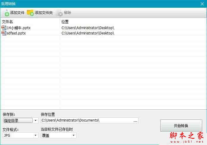 在这个批量转换窗口里,可以添加多个PPT文件,设置好保存位置等相关选项后,点击右下角“开始转换”按钮,即可以一键将所有的PPT文件转换为长图图片了。