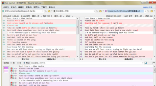 我们先打开Beyond Compare软件,选择文本合并会话,打开会话操作界面。单击“打开文件”按钮选择需要合并的文本文件。合并文本之间的差异部分以不同颜色标注显示,如下图图例所示。