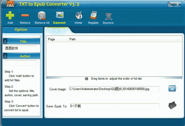 txt转epub转换器 是一款可以批量帮助你快速的将TXT文本文件格式转换成Epub电子图书格式的文档转换工具,txt转epub转换器怎么用?txt转epub转换器程序操作非常简单,你只需要添加好TXT文本,然后设置下作者和标题,还可以设置下封面图片,接着直接点击Convert按钮就可以了!