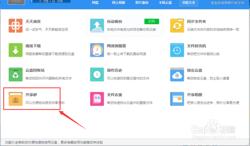 3、打开之后,我们可以在里面看到很多的功能,我们点击【共享群】,如图示。