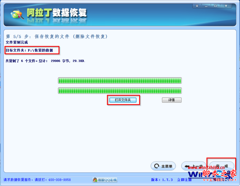 6、这时候就可以看到保存恢复的文件的位置,还可以直接点击“打开文件夹”,就可以看到你恢复的文件,点击“完成”即可。